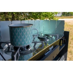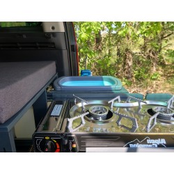 • Two-burner stove - powered by standard cartridges with a capacity of 227g - allowing for about 2-3 hours of continuous using the burner, eeach burner has an automatic sparker, smooth regulation of the flame, portable (possibility of using the oven outside the camping box), express cartridges replacement. ATTENTION. If the oven is not in use, the burners must be disconnected from the cartridges. It can be done removing the cartouches from the stove - there are two independent disconnecting switches.