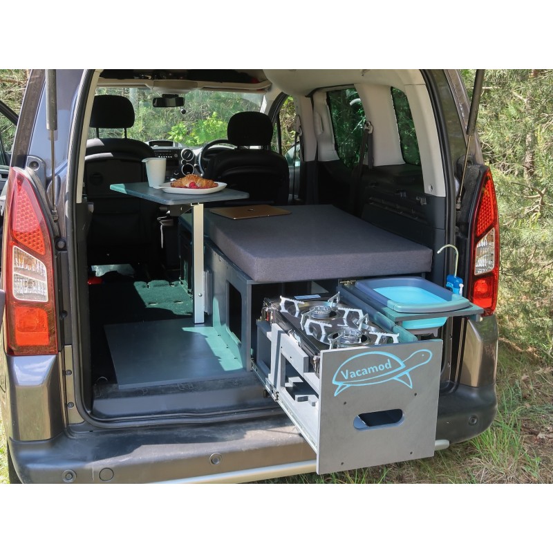 Vacamod camping system is a box which put in the trunk of a car, turns it into a mini-camper within a minute. During the trip, it serves as a storage space, a fold-out double bed, a water storage and a fully functional kitchen - ready to use right away, wherever you are.