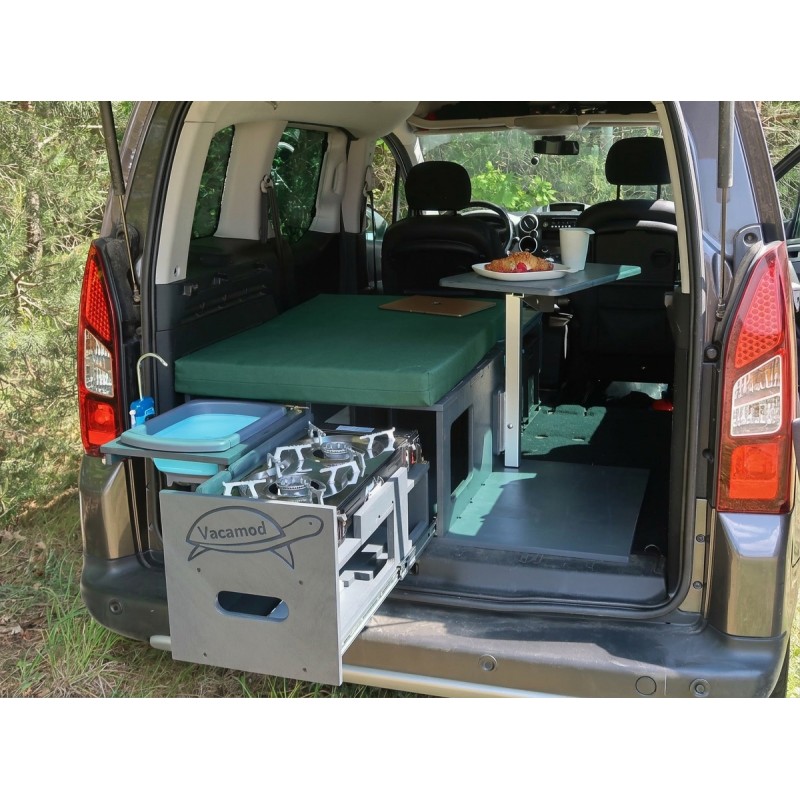 Vacamod camping system is a box which put in the trunk of a car, turns it into a mini-camper within a minute. During the trip, it serves as a storage space, a fold-out double bed, a water storage and a fully functional kitchen - ready to use right away, wherever you are.