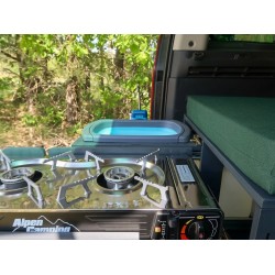 • Two-burner stove - powered by standard cartridges with a capacity of 227g - allowing for about 2-3 hours of continuous using the burner, eeach burner has an automatic sparker, smooth regulation of the flame, portable (possibility of using the oven outside the camping box), express cartridges replacement. ATTENTION. If the oven is not in use, the burners must be disconnected from the cartridges. It can be done removing the cartouches from the stove - there are two independent disconnecting switches.